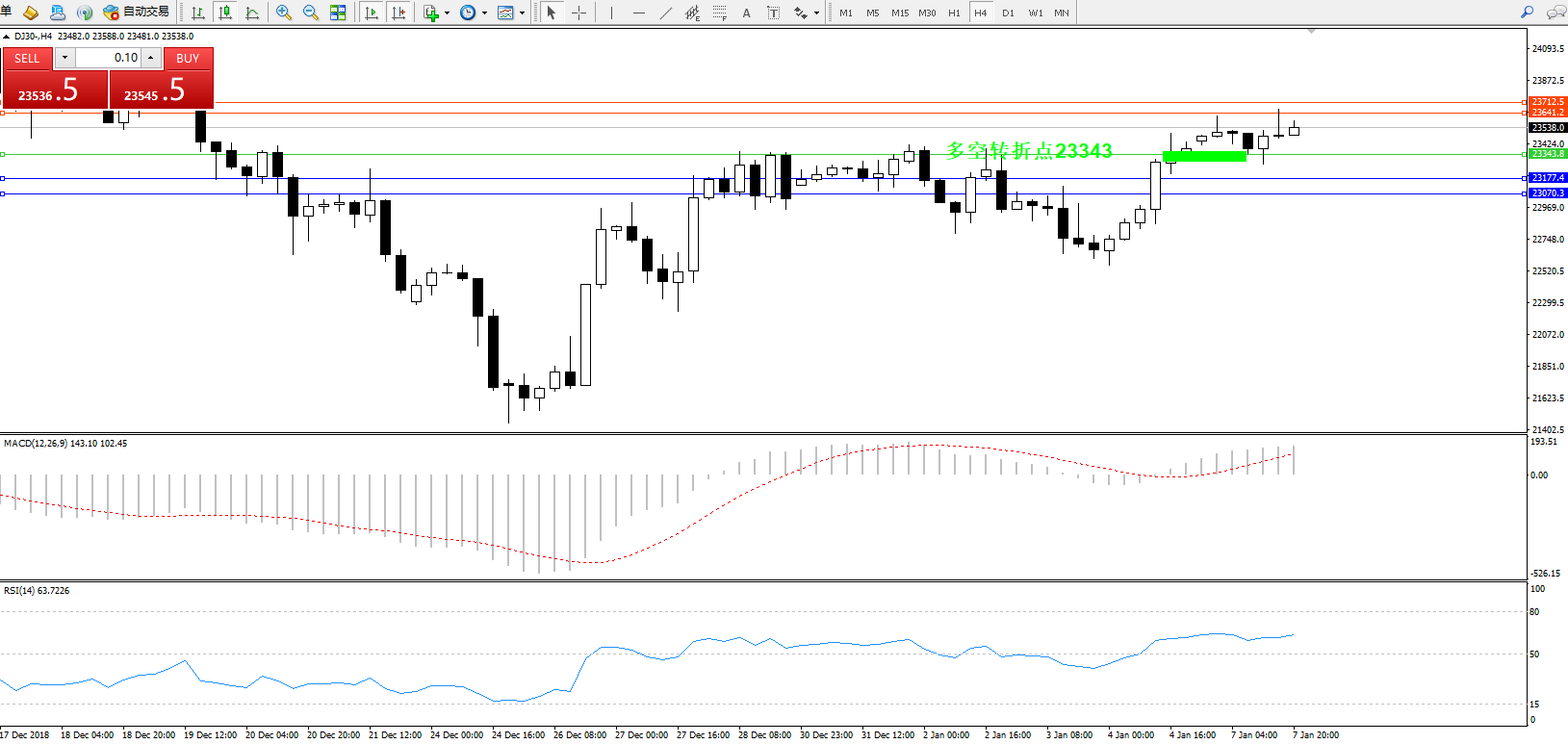 道琼斯指数DJ30—— 4小时K线图显示: