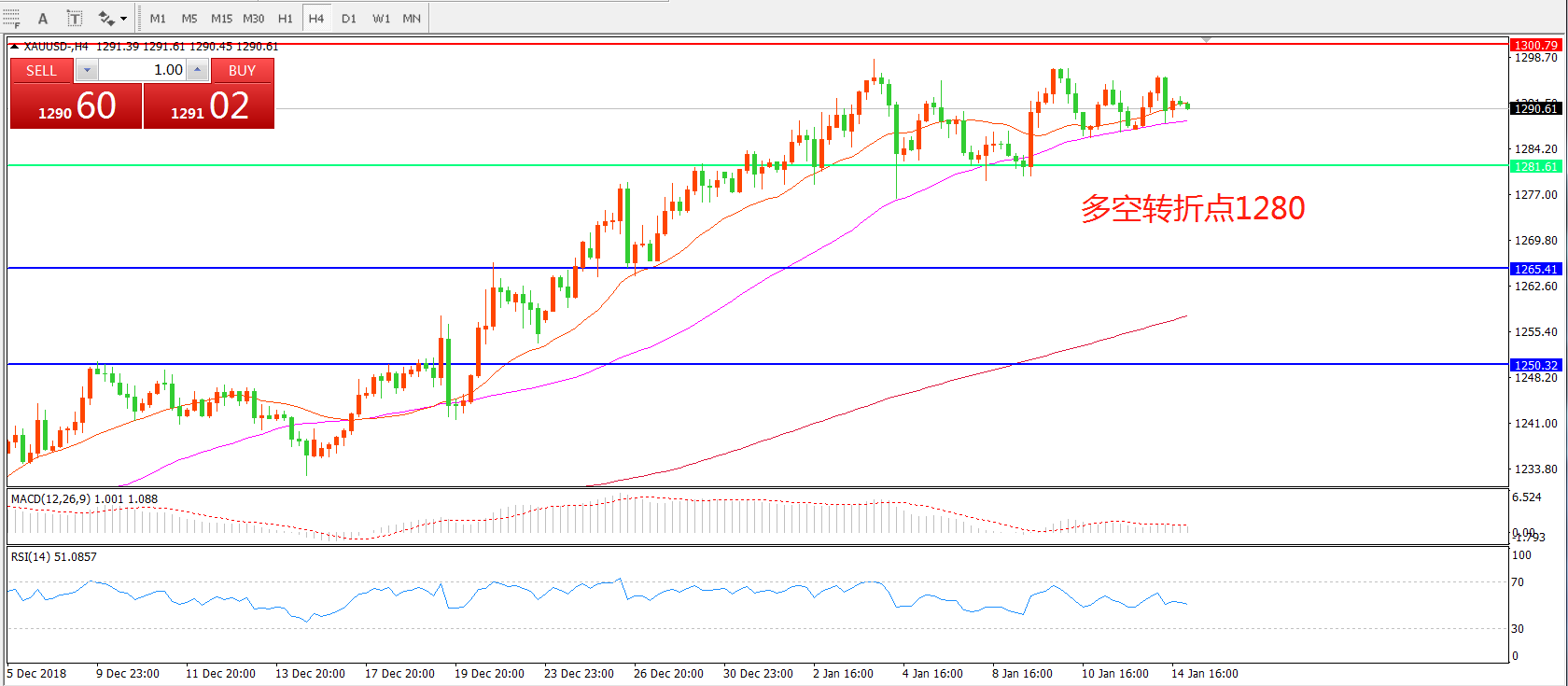 交易策略:在1280.00之上看涨,目标1300.00  1319.00
