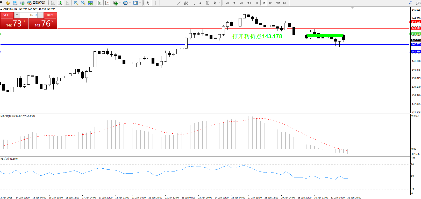 交易策略:143.178下方看跌,目标142.389141.836