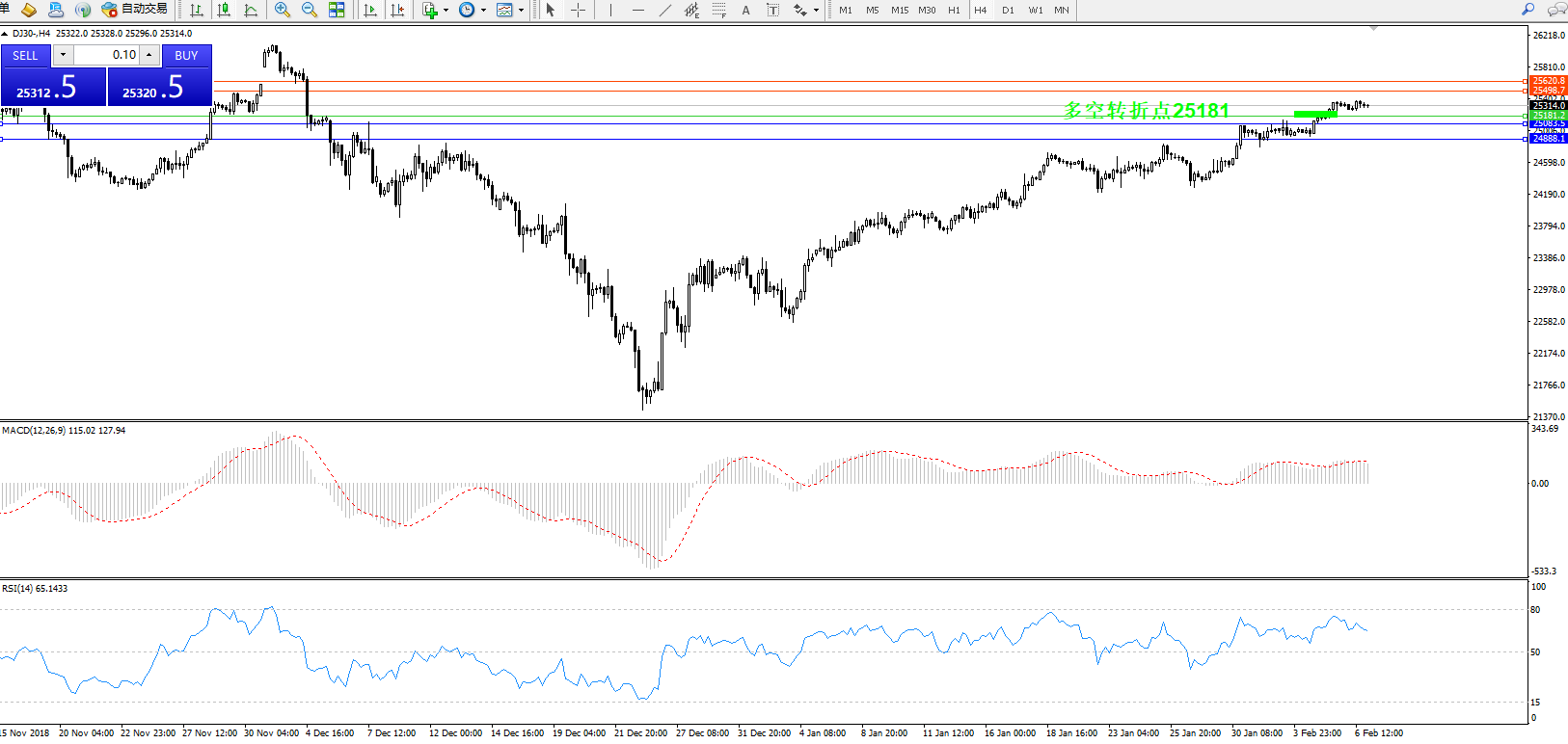 道琼斯指数DJ30—— 4小时K线图显示: