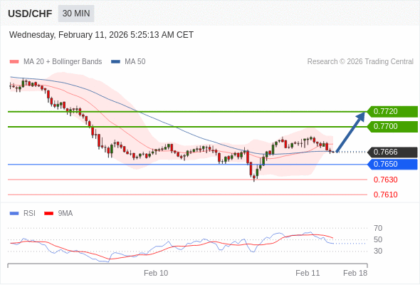 在 0.7650 之上,看涨,目标价位为 0.7700 ,然后为 0.7720 。