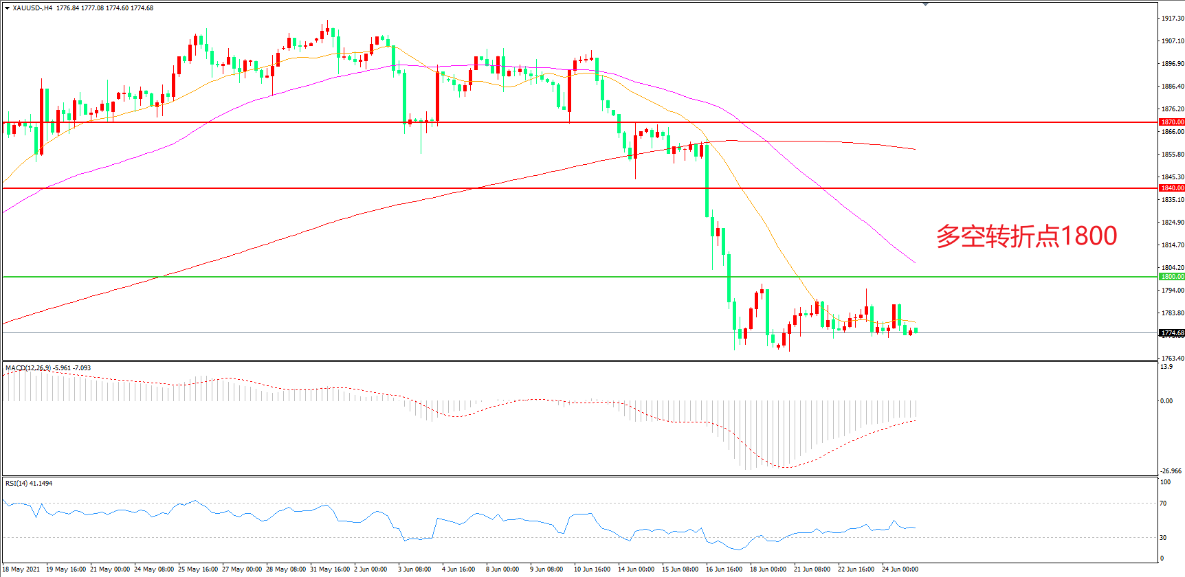 交易策略:在1800.00之下看跌,目标1760.00 1730.00