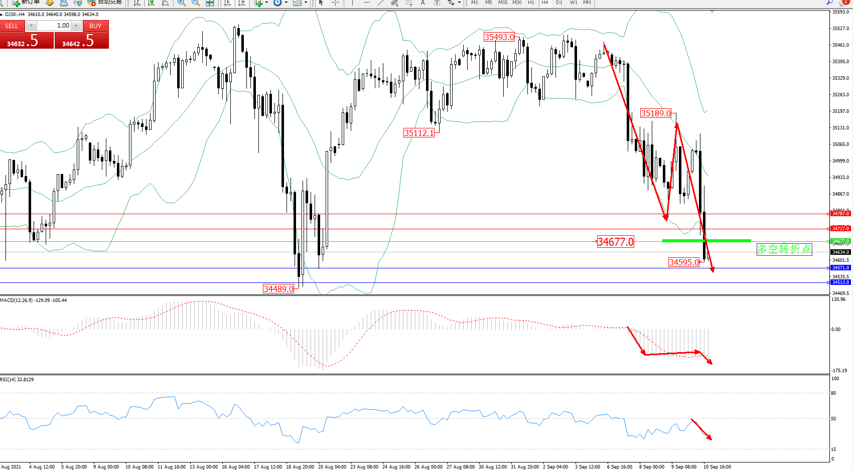 交易策略:34677下方看跌,目标34571、34513