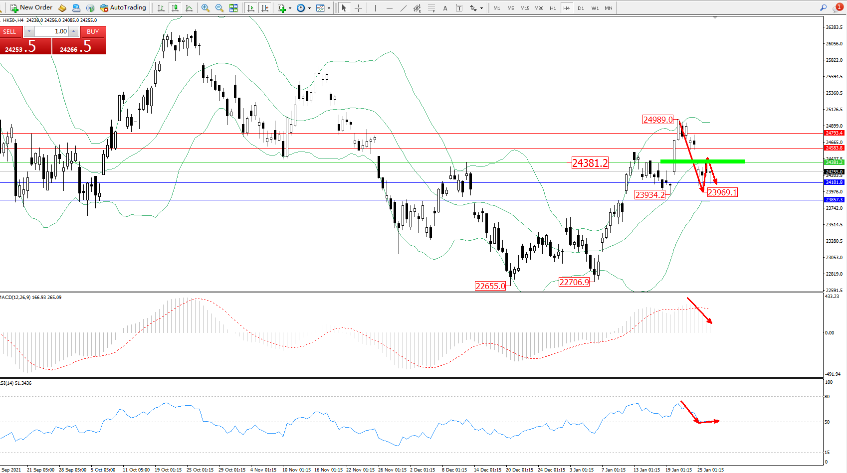 恒指HK50 ——4小时K线图显示: