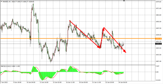 虽然上周美联储并没有因为经济衰退风险而展现出要减弱鹰派立场的意思,但经济下滑担忧还是令美元指数陷入了僵局,黄金价格走势也因此缺乏明显方向。从短期美元指数走势来看,正进入三角形整理末端,后期或打破僵局向下,将有可能对黄金价格形成提振,金价短期有望从1820附近支持区域开始走反弹趋势。