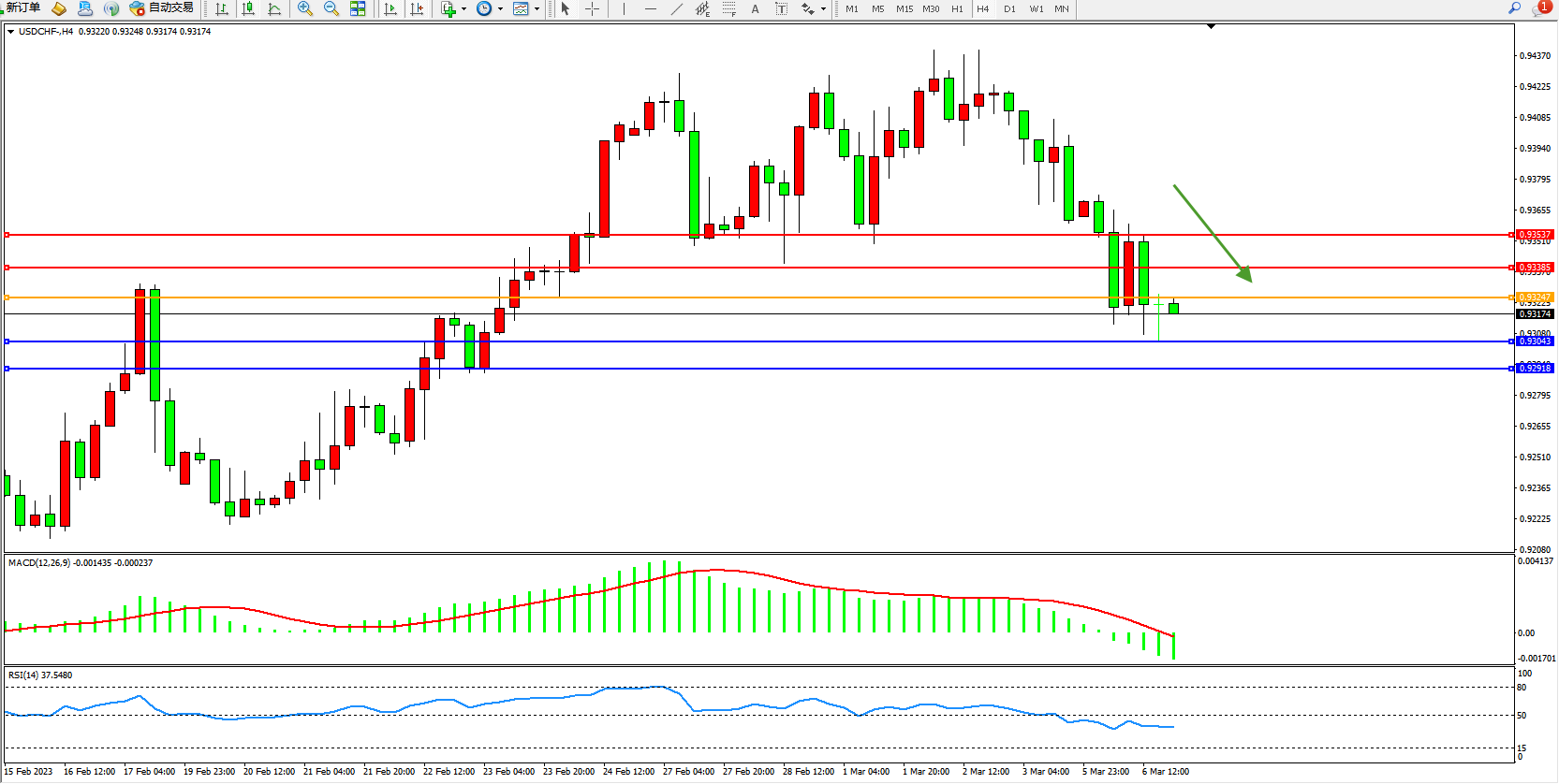 美元瑞郎USDCHF——4小时K线图显示: