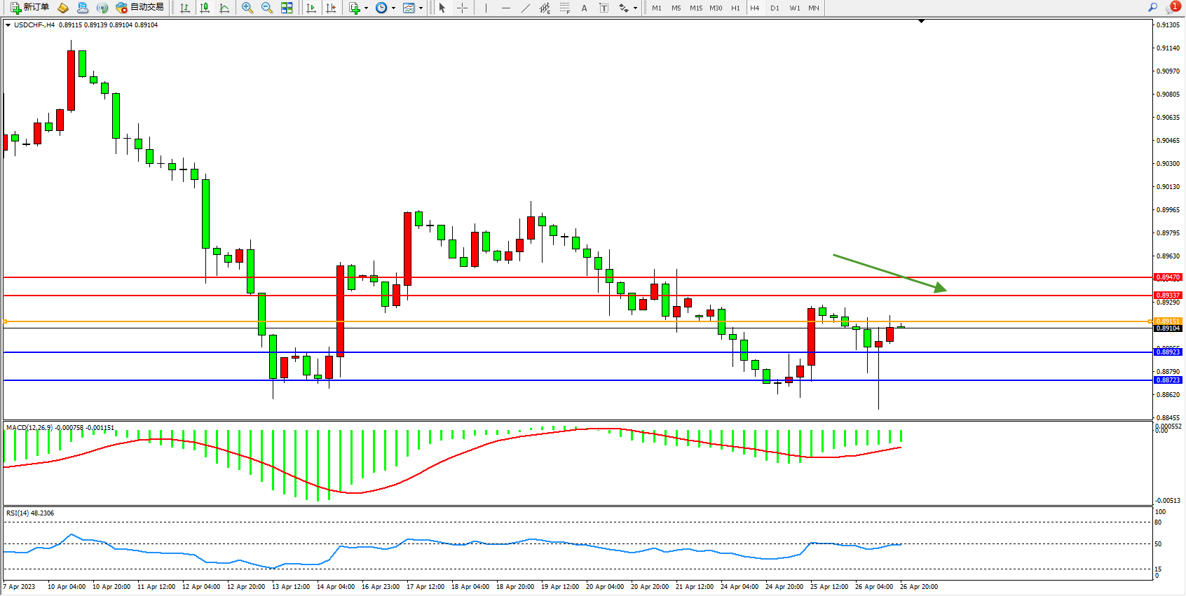 美元瑞郎USDCHF——4小时K线图显示: