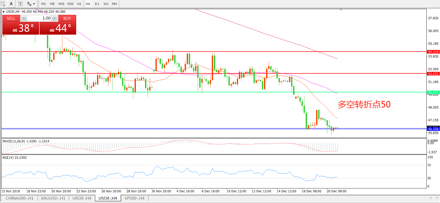 小时图看,油价跌破前期箱体低点后疲弱不堪,目前险守于46美金处。均线系统呈空头排列,MACD绿柱增加,日内仍是震荡偏空走势。